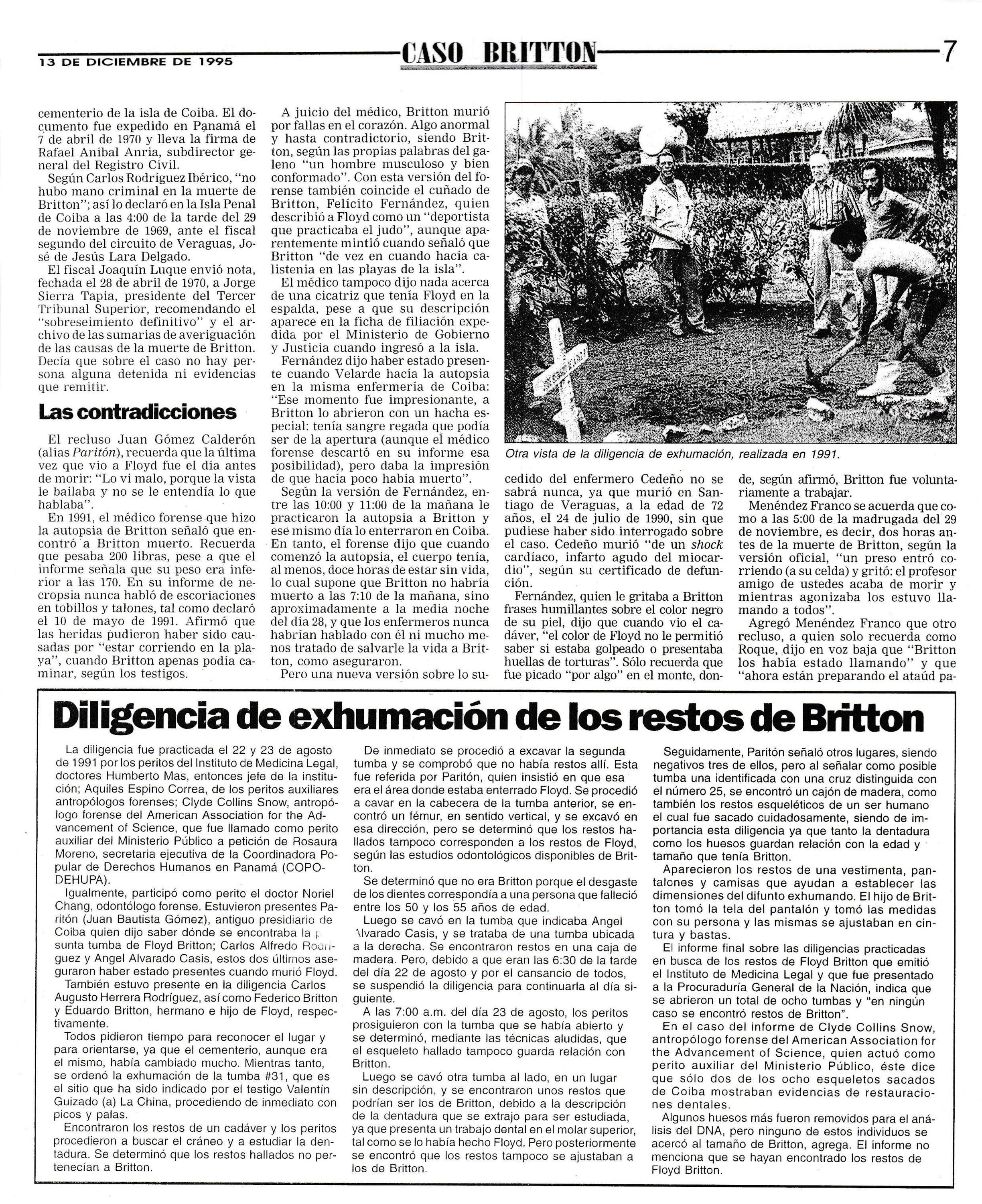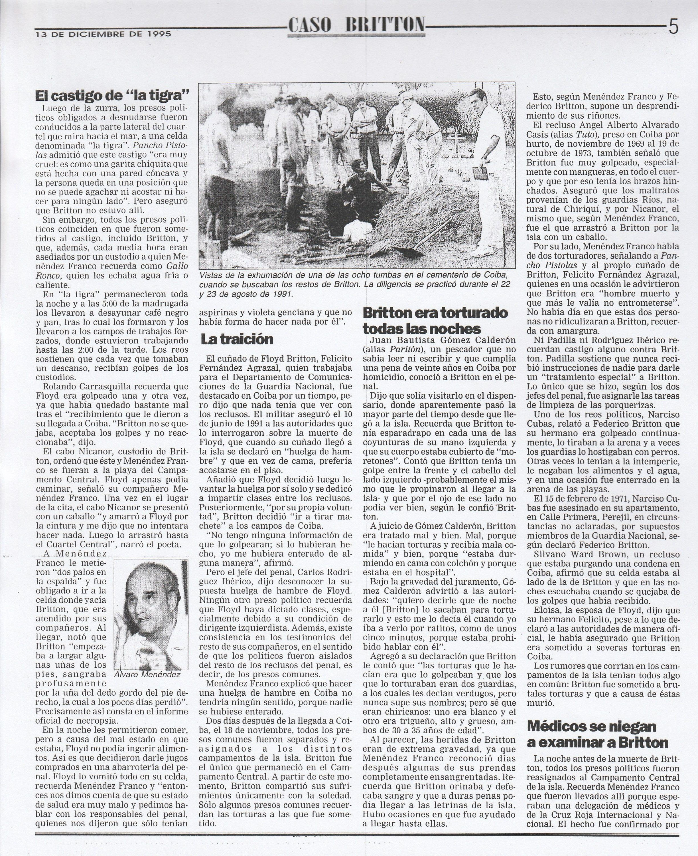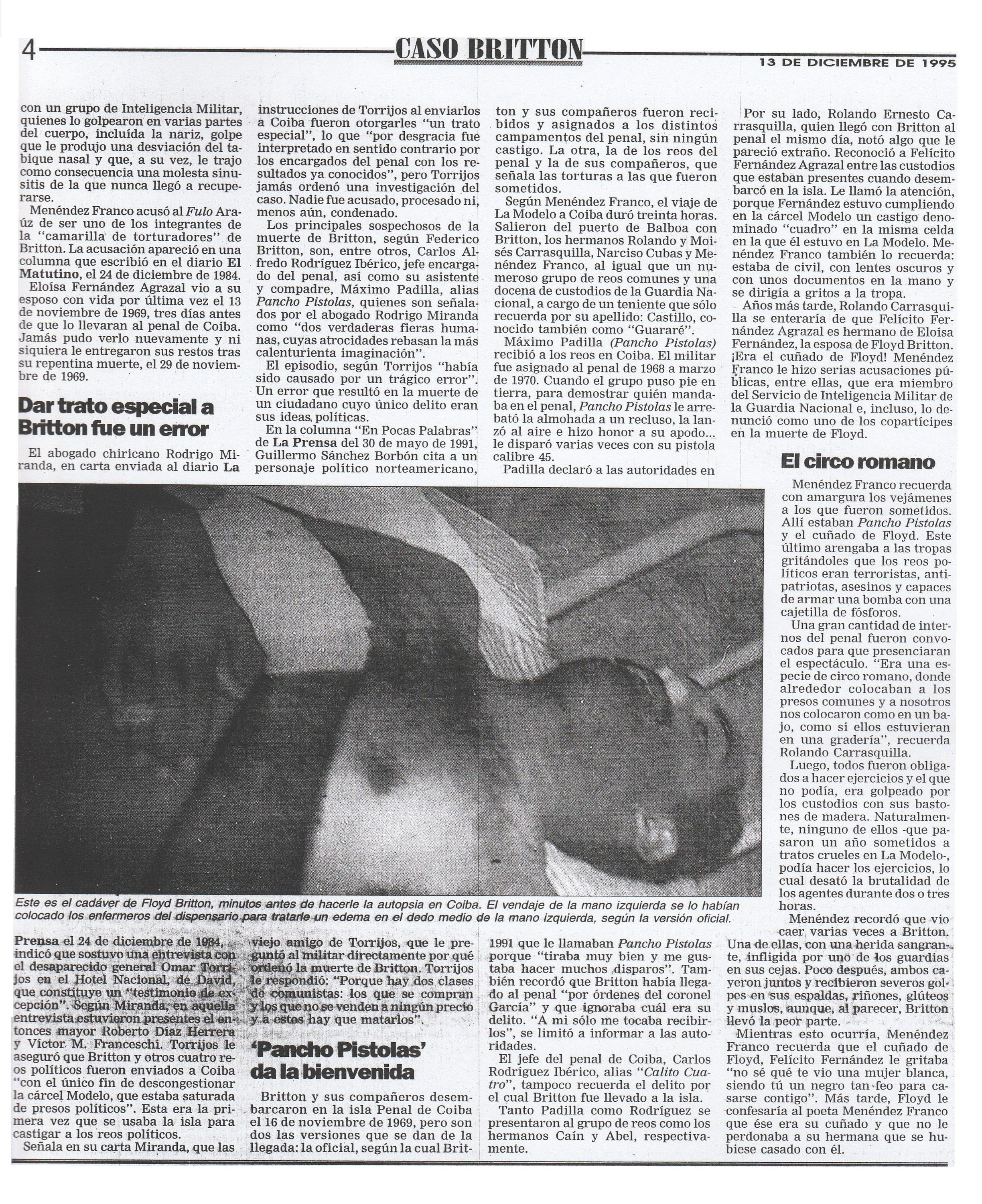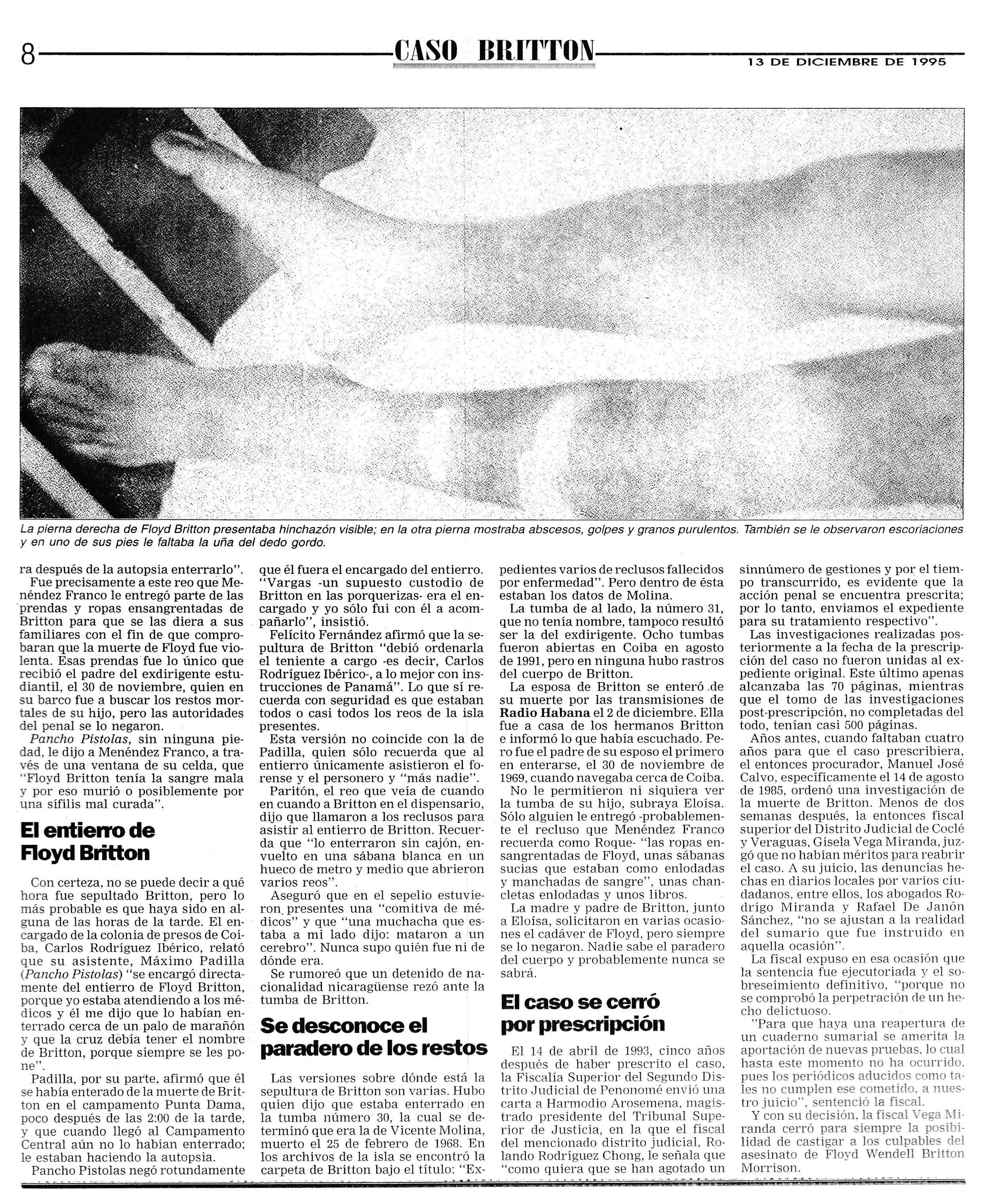 Posteriormente se presentó el oficial que se hacía llamar Pancho Pistola, con dos hombres armados y nos ordenó salir de la celda rumbo a los baños comunales, situados al final del pasillo donde se nos permitió bañarnos, pero manteniendo a los hombres armados en la puerta, volvimos a la misma celda después de ponernos ropa seca, fuimos escoltados hasta un comedor situado en aquella época de que hablo a varios metros de este cuartel, donde se nos sirvieron alimentos, pero notamos que Britton, que corrijo, no resistía los alimentos por lo cual pedimos permiso a los guardianes para encargarle unas latas de jugos a una pequeña tienda o abarrotería que funcionaba en el penal. Ya en la celda Britton vomitó los jugos, nos dimos cuenta entonces de que su estado de salud era muy malo y pedimos hablar con los responsables del penal, quienes nos dijeron que en el hospital de este penal sólo tenían aspirinas y violeta genciana y que no había forma de hacer nada por él. Le planteamos entonces llevarlo a tierra firme o traer médicos; esta conversación se sostuvo con el dirigente del penal de apellido Rodríguez y con el subdirector de apellido Padilla, sin embargo no parecieron darle importancia a nuestra petición. Pasada una semana con trabajos de esta índole en el campo y la misma jornada de escolta para todos nuestros movimientos, fuimos separados... los hermanos Carrasquilla fueron asignados a un campamento llamado Catival; Narciso Cubas fue asignado al campamento de Punta Damas y yo fui llevado por mar al campamento de Río San Juan; Britton permaneció en el cuartel central. La noche del 28 de noviembre de 1969, fuimos traídos todos nuevamente a la misma celda, pues se esperaba en la mañana del 29 de noviembre una delegación de médicos y de la Cruz Roja nacional e internacional que visitaría la Isla Penal de Coiba. Nos extrañó que en dicha celda encontramos la ropa de Floyd Britton empapada en sangre y él no se encontraba en la celda, pero se nos echó llave y se prohibió a los reclusos políticos que estaban en otras celdas y a los presos comunes ni siquiera acercarse a la ya mencionada celda del cuartel central. A eso de las cinco de la mañana, un preso entró corriendo y gritó: el profesor amigo de ustedes acaba de morir y mientras agonizaba los estuvo llamando a todos". |
